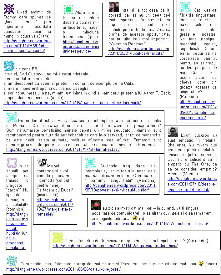 E o selectie, inevitabil subiectiva, a câtorva dintre comentariile care m-au delectat, m-au instruit, mi-au fost utile, sau m-au provocat sa gândesc si altfel lucrurile.