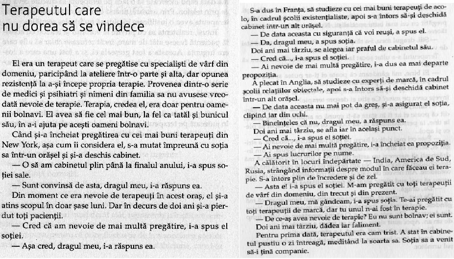– E absurd, a spus el, întrerupând-o. Cum ar putea ei să mă înveţe ceva pe mine? Ce ştiu ei despre terapie?