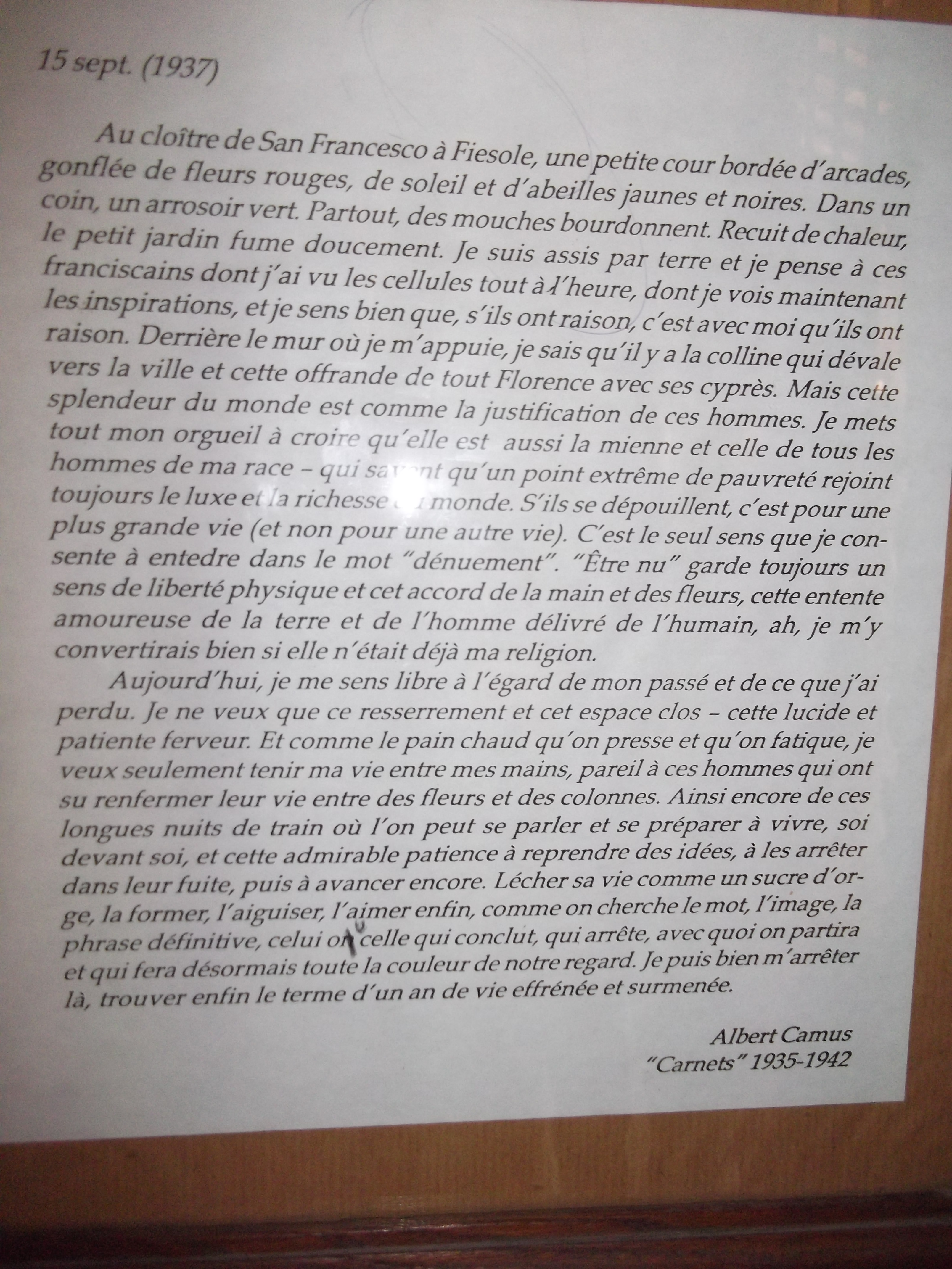 Şi totuşi nu a fost doar o vizită fugară a lui Camus, ci o întâlnire adevărată cu vieţuitorii de aici. Franciscanii i-au păstrat amintirea în muzeul lor: chiar înainte de a intra în zona de vizitare a chiliilor au pus un citat amplu din jurnalul scriitorului.