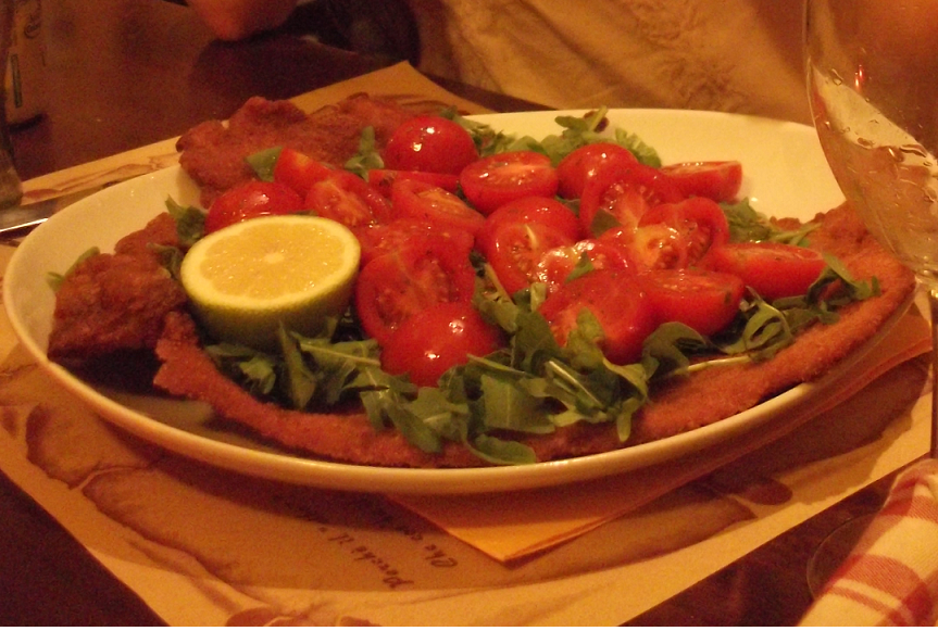 - Cotoletta alla milanese con rucola e pomodorini (Italia e singura ţară la vest de Sarajevo unde roşiile sunt la fel de bune ca la noi, în Balcani)
