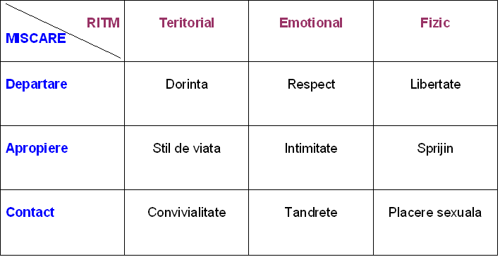 In dinamica relatiei sexuale intr-un cuplu putem distinge trei miscari (departare – apropiere – contact) si trei ritmuri (teritorial, emotional, fizic).