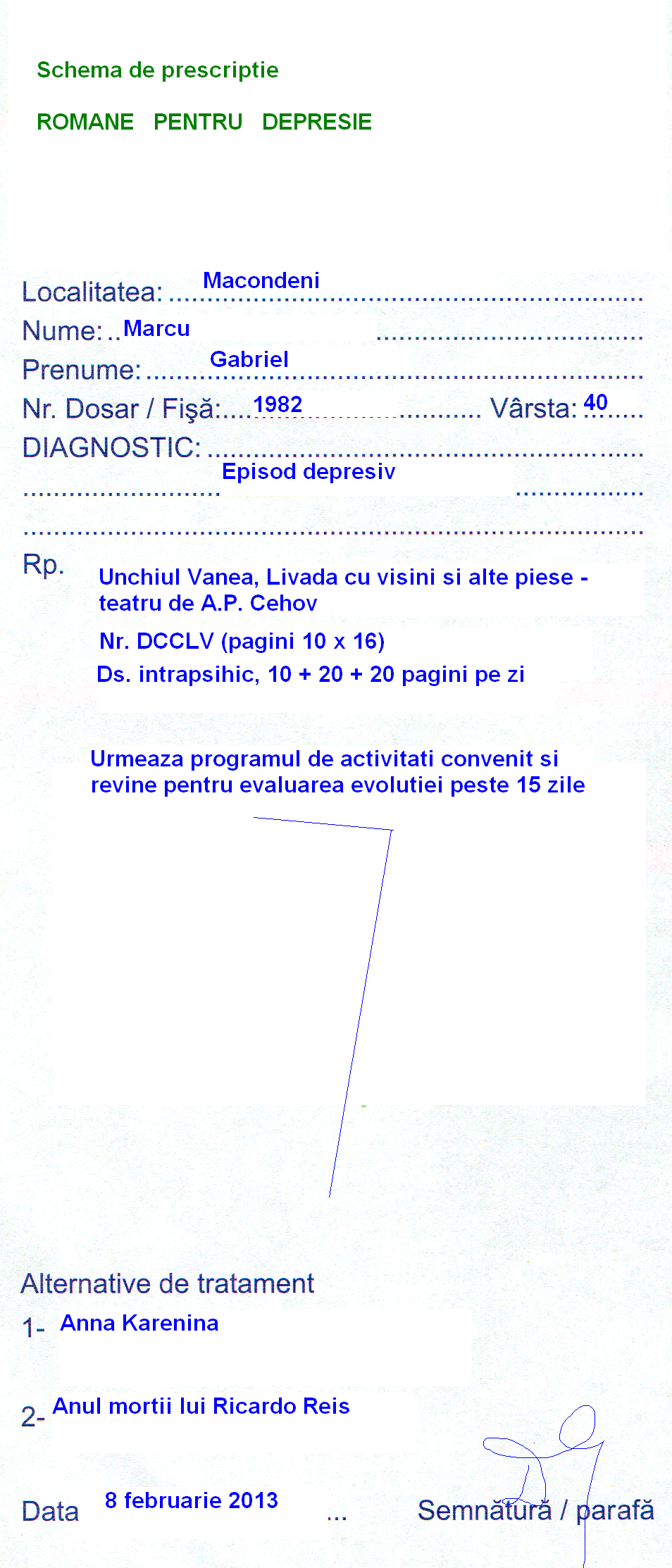 Alchimistul si oricare dintre operele doctorului Cehov sunt si pe lista mea. Daca ar fi sa mai numesc trei titluri utile in depresie, acestea ar fi Anna Karenina de Lev Tolstoi, Ciuma de Albert Camus si Anul mortii lui Ricardo Reis de José Saramago.
